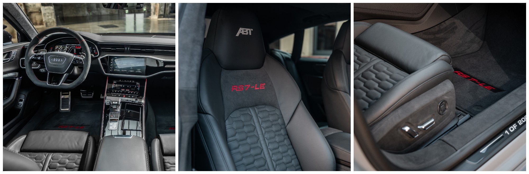 Thêm vào đó, ABT RS7 Legacy Edition còn gây ấn tượng với những giá trị bên trong. ABT Sportsline đã tinh chỉnh nội thất bằng vải Dinamica trên nắp cần số, bảng điều khiển bên cạnh nhiều chi tiết trang trí khung ghế. Bề mặt mềm, giống như da lộn này không chỉ có khả năng chống cháy đặc biệt mà còn bảo vệ tối ưu khỏi độ ẩm, bụi bẩn nhờ lớp phủ công nghệ Teflon. Mẫu đặc biệt ABT RS7-LE cũng được phân biệt trực quan với RS7 tiêu chuẩn bằng cách tinh chỉnh hàng ghế trước với logo ABT ở tựa đầu và logo RS7-LE đầu tựa lưng. Logo tương ứng cũng được thêu trên thảm sàn ABT.