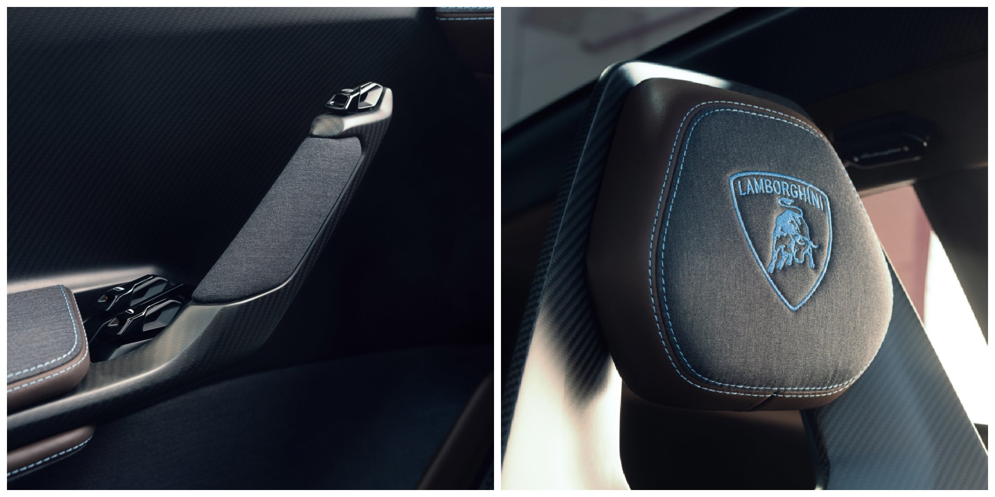 Nội thất được làm từ gần như toàn bộ những vật liệu bền vững, và tất cả đều được sản xuất tại Ý. Chất liệu len Merino cao cấp (từ một đối tác ở Italy cung cấp cho Lamborghini có Chứng nhận B) được dùng để trang trí bản điều khiển, ghế ngồi và các tấm táp-pi cửa, chỉ khâu màu được làm từ chất liệu nylon tái chế, nhựa tái chế và nhiều loại nhựa vô hình để tái chế thành sợi in 3D dùng cho phần lót đệm ghế thể thao. Ngay cả chi tiết carbon được dùng rộng rãi trên chiếc xe, xuất hiện trên bảng điều khiển trung tâm và các tấm táp-pi cửa, cũng được làm từ carbon được tái tạo – đây là một vật liệu tổng hợp hai lớp mới.