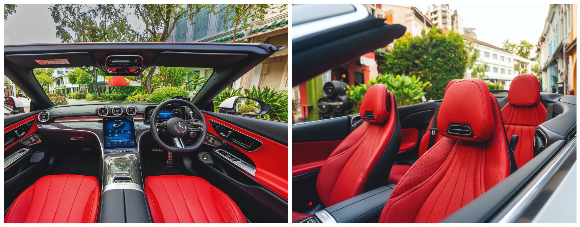 Cũng như mẫu CLE 53 4MATIC+, nội thất của CLE Cabriolet trang bị màn hình hiển thị kỹ thuật số hoàn toàn 12.3 inch và màn hình trung tâm hướng về phía người lái 11.9 inch theo định dạng đứng. Tuy nhiên, màn hình điện tử trung tâm có thể nghiêng từ 15 đến 40 độ để tránh độ chói từ ánh sáng mặt trời, đặc biệt khi mui xe đã được hạ xuống.