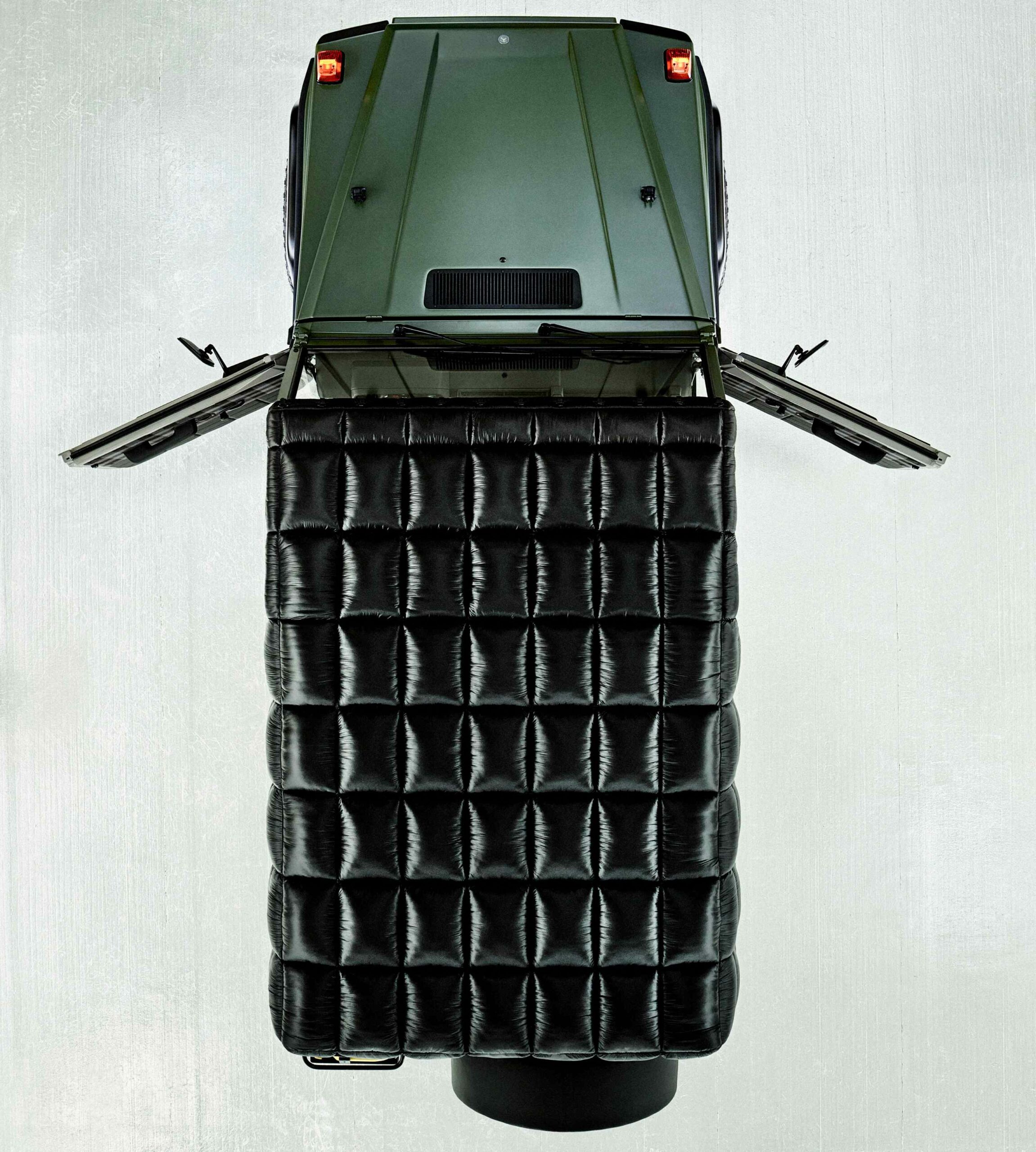 Các yếu tố thiết kế cùng chức năng đặc trưng G-Class cabriolet vẫn được bảo tồn, gồm bánh dự phòng, bánh thép đen theo thiết kế thập niên 90, kính chắn gió có thể gập lại cùng bình xăng màu vàng