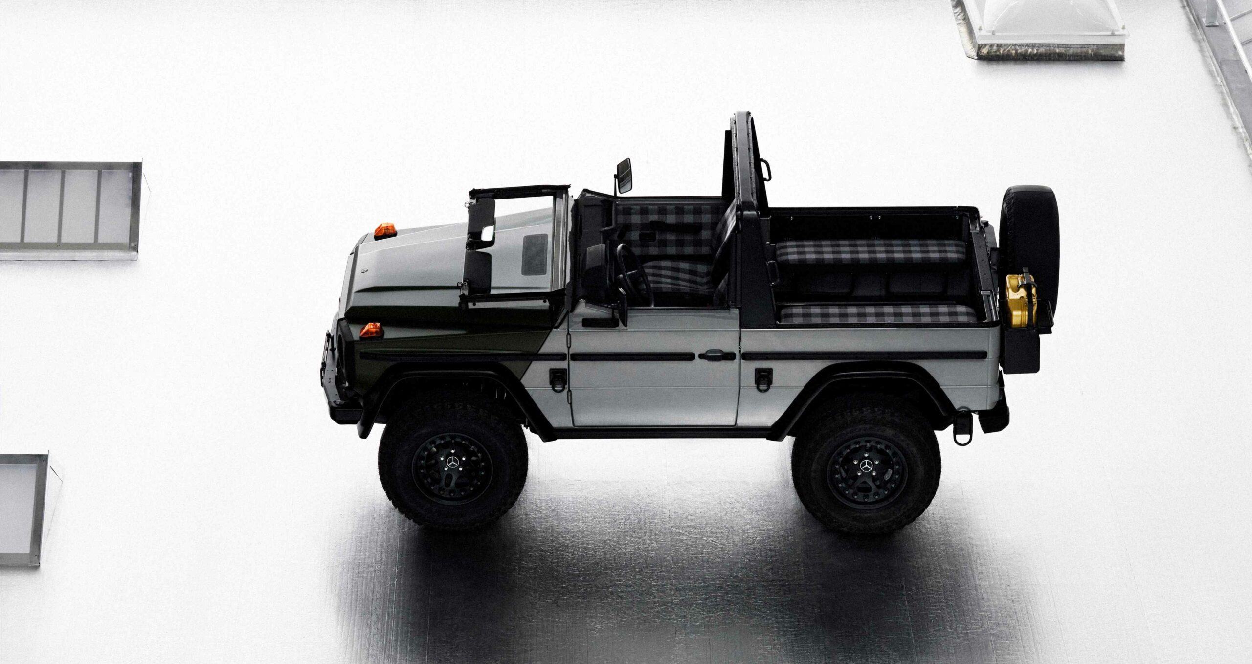 Những đường nét đẹp mắt của G-Class cabriolet cổ điển mang lại phong cách hiện đại trong khi các yếu tố thiết kế cùng chức năng đặc trưng cỗ xe vẫn được bảo tồn và tái hiện lại cho ngày nay. Chúng bao gồm bánh dự phòng mang tính biểu tượng gắn trên cửa sau, bánh thép màu đen theo thiết kế của thập niên 90, kính chắn gió có thể gập lại cùng bình xăng màu vàng. Nội thất cũng đã trải qua sự biến đổi. Trong số các yếu tố khác, Devon Turnbull, người đam mê G-Class – nổi tiếng với hệ thống âm thanh sống động – đã thiết kế một hệ thống âm thanh tích hợp liền mạch, cả về mặt kỹ thuật lẫn hình ảnh. Những máy phát âm thanh gắn trên thanh liên kết phía trên có thể chuyển đổi và – giống như toàn bộ mui xe, loa – có thể được tháo rời. Ghế bọc ca-rô thể hiện sự tôn trọng thiết kế từ các mẫu G-Class trước đó. Các điểm nhấn màu cam xen kẽ vàng tạo ra sự kết nối trực quan với bộ sưu tập thời trang đồng sáng tạo bởi Mercedes-Benz, Moncler và NIGO.