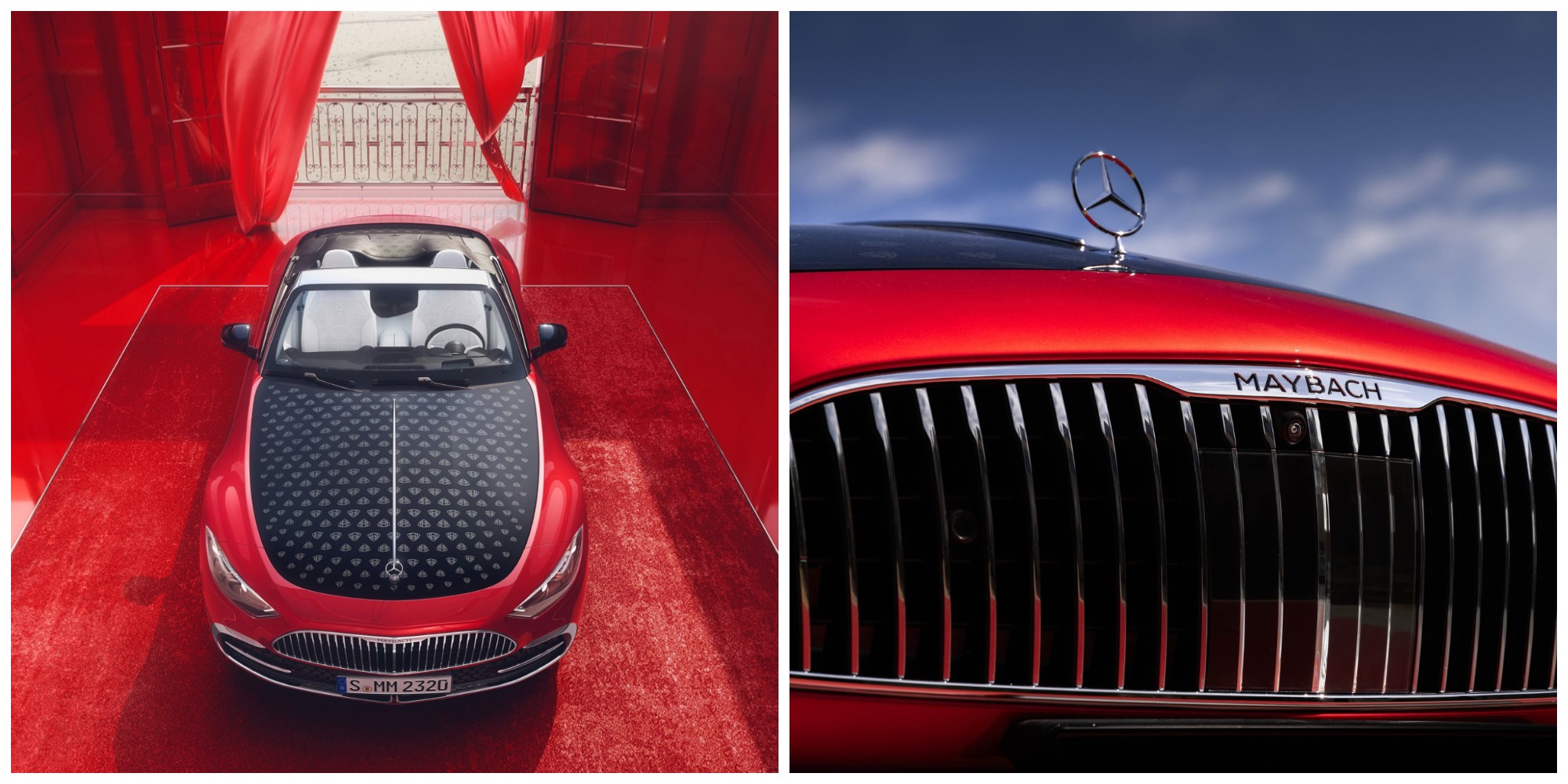 Lập tức thu hút ánh nhìn, đường viền lưới tản nhiệt mạ crôm đặc trưng Maybach sáng bóng, nêu bật dòng chữ MAYBACH tích hợp vô cùng tinh xảo. Mui xe kiêu hãnh trưng bày hình ngôi sao Mercedes thẳng đứng bên cạnh chi tiết mạ chrome chạy dọc ở giữa. Nâng cao hơn nữa tính độc quyền, mui Obsidian Black Metallic khoe họa tiết Maybach kết hợp trong sắc xám than chì. Các chi tiết ngoại thất tinh tế tiếp tục với tổ hợp điểm nhấn màu vàng hồng trang trí đèn pha, khung kính chắn gió và tấm ngưỡng cửa bên nổi bật chi tiết chrome tích hợp. Như ta thấy, mặt trước độc đáo nhấn mạnh chiều rộng của xe với hệ thống khe hút gió ngang. Nét đặc biệt tổng thể càng được tăng cường với bánh Maybach 21 inch độc quyền kiểu Monoblock 5 lỗ hoặc đa chấu.