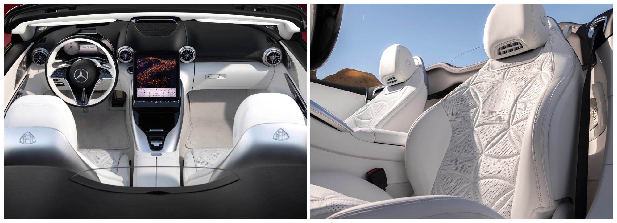 Bên trong, da Nappa MANUFAKTUR Crystal White trải qua quy trình thuộc bền vững, kiến tạo bầu không gian tinh tế. Vật liệu độc quyền này mở rộng đến tấm cửa, bảng điều khiển trung tâm cùng ghế ngồi thoải mái. Bọc da cả trước lẫn sau, ghế có thiết kế hình học độc đáo mới tương phản cùng tựa lưng và viền mạ crôm màu bạc. Màn hình trình điều khiển kỹ thuật số cùng màn hình đa phương tiện trung tâm điều chỉnh bằng điện có các hình ảnh động và kiểu hiển thị khởi động dành riêng Maybach. Dấu ấn thương hiệu còn hiển hiện ở vô lăng, bàn đạp cùng bệ cửa thép không gỉ bóng loáng.