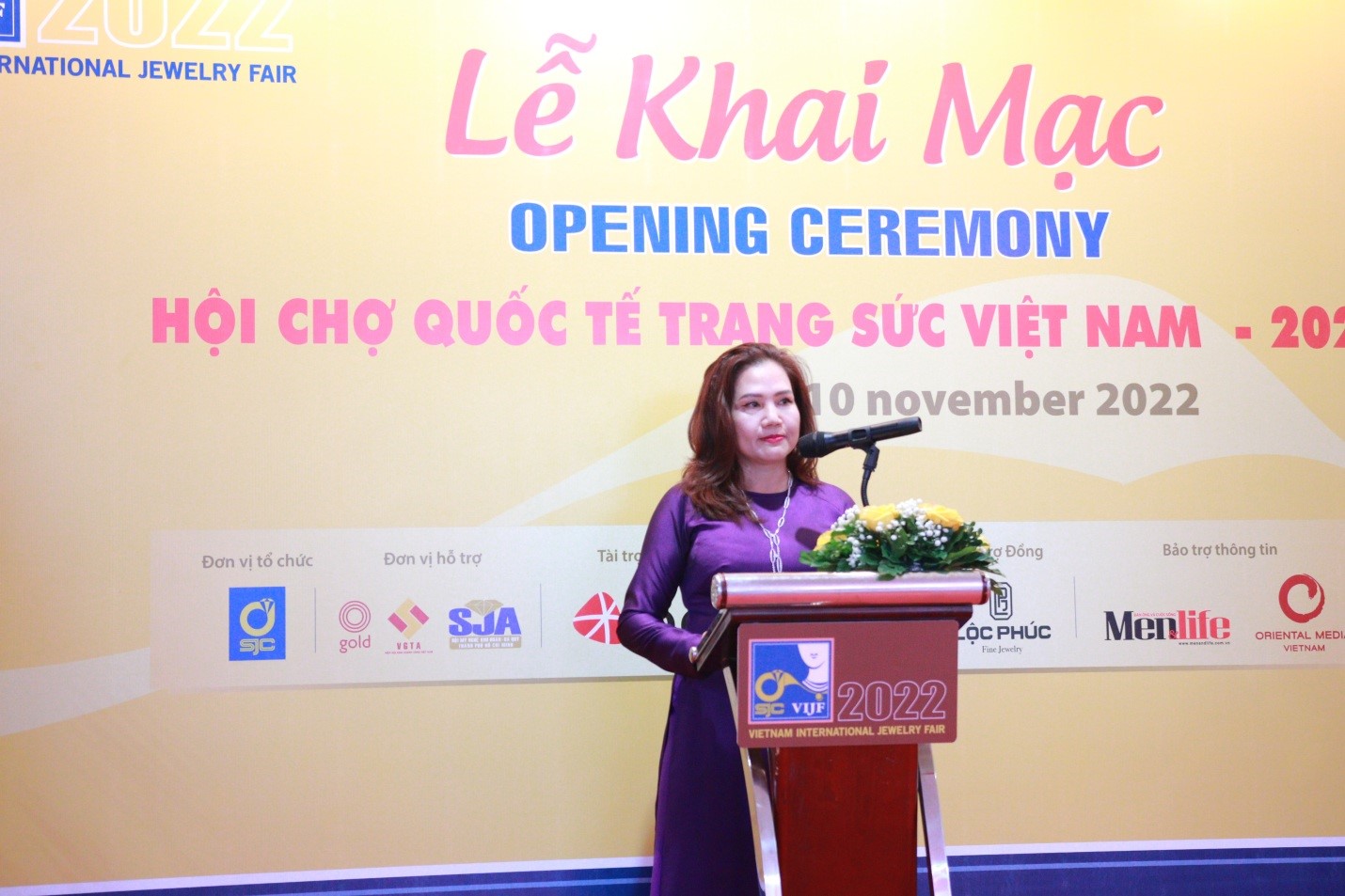 Bà Lê Thúy Hằng – Tổng Giám Đốc Công ty SJC, Trưởng ban Tổ chức Hội chợ VIJF 2022 gửi lời tri ân sâu sắc đến Ủy ban nhân dân TP.HCM, Hội Kinh Doanh Vàng Việt Nam và Hội Mỹ Nghệ Kim Hoàn Đá Quý TP. Hồ Chí Minh đã hỗ trợ cho công ty SJC phối hợp cùng các nhà tài trợ tổ chức Hội Chợ Quốc tế Trang sức Việt Nam – VIJF lần thứ 29, năm 2022, tạo điều kiện cho các doanh nghiệp trong ngành kim hoàn có dịp gặp gỡ, giao lưu chia sẻ và quảng bá thương hiệu và dịch vụ đến khách hàng.