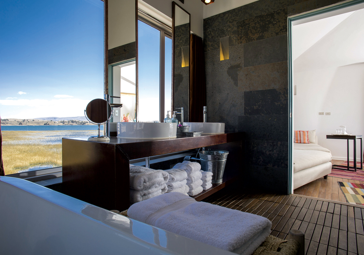 Mặt kính phản chiếu ánh nắng từ trần đến sàn được trang trí đẹp mắt với những sản phẩm dệt thủ công tỉ mỉ được tạo nên bởi bàn tay khéo léo của những thợ bậc thầy tại địa phương. Bước ra bên ngoài là khoảng sân thượng rộng rãi được trang bị giường daybed sang trọng cùng ghế xếp thoải mái mang đến không gian lý tưởng cho du khách có thể thư thái ngắm nhìn nhiều điều kỳ diệu từ vùng hồ Titicaca huyền bí. Chẳng gì có thể tuyệt vời hơn khi được vùi mình trong chiếc chăn Andean ấm áp, an yên tận hưởng ánh hoàng hôn rực rỡ trong khi nhấm nháp ly cocktail pisco.