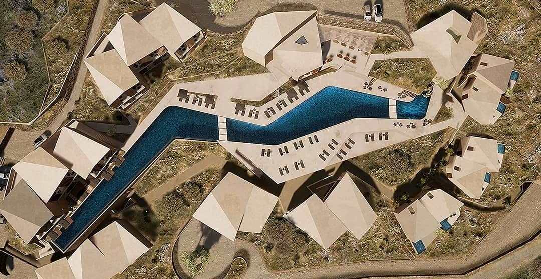 Ẩn mình trên phần đất dốc dọc phía nam đảo Meganisi – Hy Lạp, Ampia Vista Retreat nhìn ra vịnh xanh ngát một màu là chốn dừng chân tuyệt vời. Các khối nhà kết nối với nhau như dây xích và neo quanh một hồ bơi lớn hình zic zac, đóng vai trò tâm điểm giúp khách di chuyển dễ dàng hơn trong khu phức hợp.