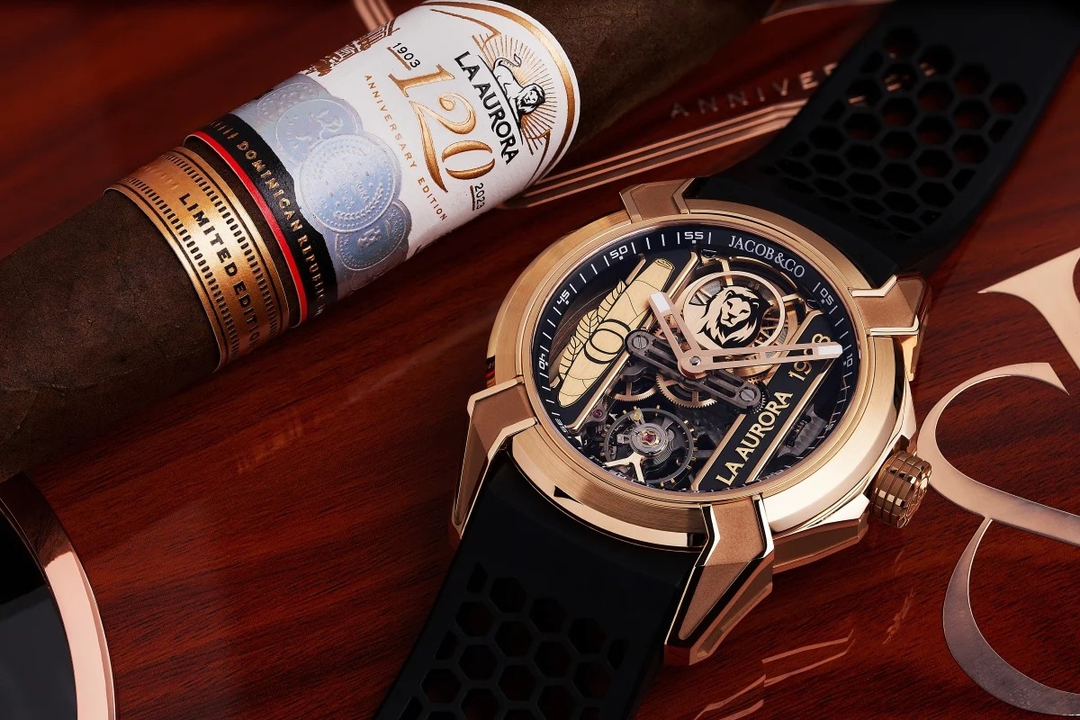 Thương hiệu xì gà đẳng cấp thế giới La Aurora đánh dấu sinh nhật tuổi 120 với La Aurora 120th Anniversary cigar và thiết kế đồng hồ Epic X ấn tượng thực hiện bởi Jacob & Co.. Từng chiếc đồng hồ vàng hồng quý giá thêm phong cách khi song hành cùng hộp giữ ẩm tùy chỉnh cũng như 10 điếu xì gà phiên bản kỉ niệm.