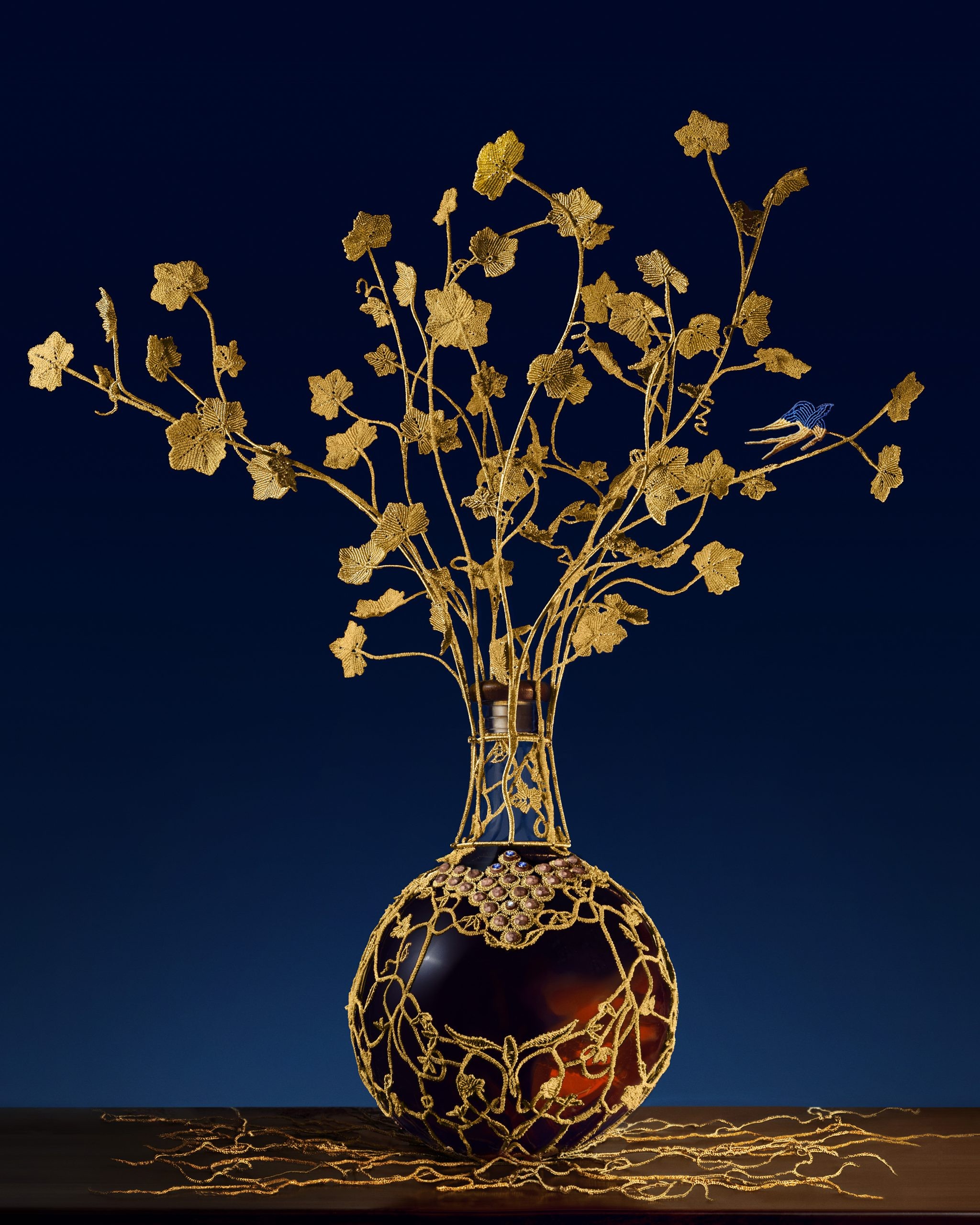 Laurentine tỉ mỉ làm việc với sợi vàng quý giá cung cấp bởi nhà sản xuất lâu đời duy nhất còn hoạt động, có trụ sở tại Lyon, Pháp. Cô đã biến từng sợi chỉ vàng thành hình dạng lộng lẫy, cầu kỳ, làm nên bộ rễ điểm xuyết tổ hợp hạt vàng nhỏ, đường tua xoắn ôm lấy phần thân bằng thủy tinh, và sự bùng nổ của những chiếc lá sống động quanh cổ chai, bên cạnh hình ảnh chú én, đặc điểm gắn liền Martell. Thiết kế thêm phần nổi bật nhờ 3 viên sapphire tổng hợp, phản chiếu màu xanh lam của thương hiệu cognac nước Pháp và viên kim cương duy nhất nạm trên đế vàng 22 carat, cũng như tác phẩm trang trí gồm các viên gỗ sồi 300 năm tuổi 40 mặt cắt, gợi liên tưởng đến chuyên môn thủ công mà Martell âm thầm dưỡng nuôi qua nhiều thế kỷ. Để tác phẩm trở yêu cầu 800 giờ lao động trở nên hoàn hảo nhất, Laurentine hợp tác cùng hai nghệ nhân có chuyên môn cao, một thợ kim hoàn và một thợ mộc.