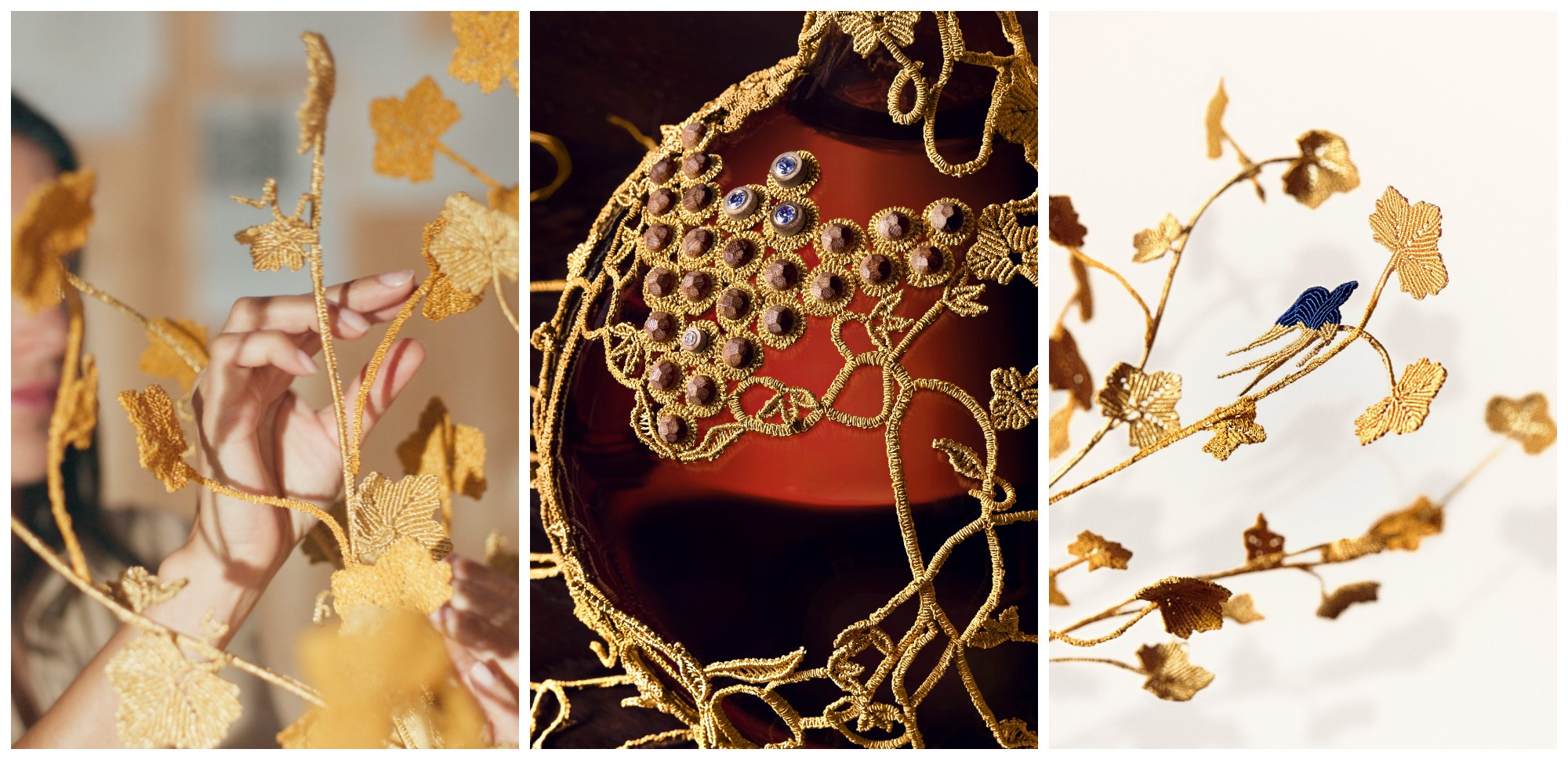 Đồng thời, hãng cognac nổi tiếng ủy quyền cho nghệ sĩ người Pháp Laurentine Perilhou, người đã nâng nghề đan thắt thành một nghệ thuật tinh tế. Trong mối quan hệ hợp tác cùng Martell, Laurentine ‘viết nên’ bản tình ca tán dương thiên nhiên và hương vị cognac tuyệt vời. Được làm bằng sợi vàng thật, sáng tạo của Laurentine tượng trưng cho hành trình của cây nho khi hút dinh dưỡng cần thiết qua rễ để đâm chồi mạnh mẽ, rồi đơm quả ngọt làm nên loại cognac Martell quý giá. Theo lời chia sẻ của nữ nghệ nhân: “Mục đích của tôi là làm cho những thứ vô hình trở nên hữu hình… từ Trái đất đến Mặt trời, từ rễ cây nhẹ len trong đất đến lá nho hướng lên trên để đón nắng, gió”.