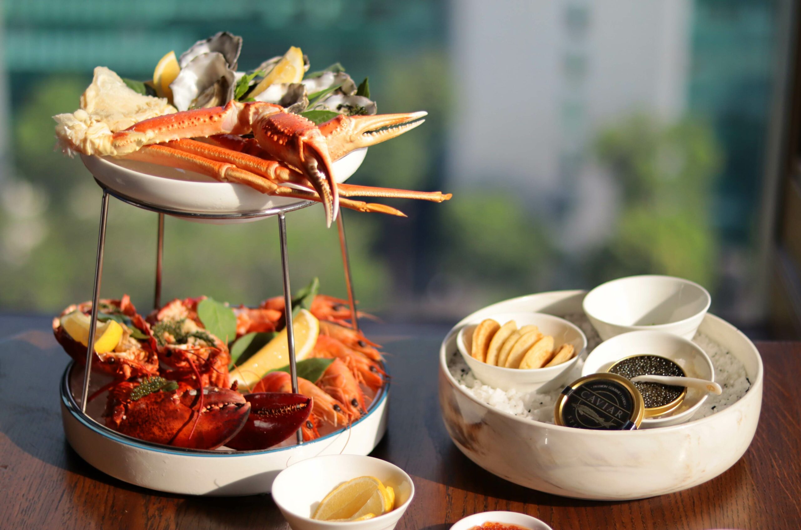 Trải nghiệm ẩm thực bắt đầu với những đĩa hải sản tươi ngon, một các khai vị đầy hoàn hảo và phong phú, kết hợp bùng nổ với Champagne. Chìm đắm trong hương vị mát lạnh của đĩa hàu châu Âu chất lượng, đi kèm cùng rong biển tươi mát, dùng cùng các loại nước sốt và gia vị được chọn lọc tỉ mỉ. Tiếp nối là loạt hải sản cao cấp mang trọn hương vị biển khơi đến giữa Thành Phố, với tôm sú, tôm hùm Mĩ ngọt vị, cua tuyết tươi ngon và những lát cá hồi béo ngậy. Bên cạnh hương vị mát lạnh ấy, vị giác của thực khách sẽ được cân bằng trở lại với món sò nghêu hấp ấm nóng, dậy hương chanh và rau mùi tây tươi ngon. Điểm nhấn của phần khai vị, hẳn sẽ là phần trứng cá tầm xa hoa với trứng cá hồi Ikura hảo hạng, cùng Tobiko xông khói, kem chua, bánh blini và nhiều loại gia vị. Phần khai vị sẽ kết thúc hấp dẫn hơn với Atisô hầm, kết hợp cùng thịt nguội Tây Ban Nha ủ lâu năm, phô mai feta đánh bông, bơ nâu và sốt nụ bạch hoa.