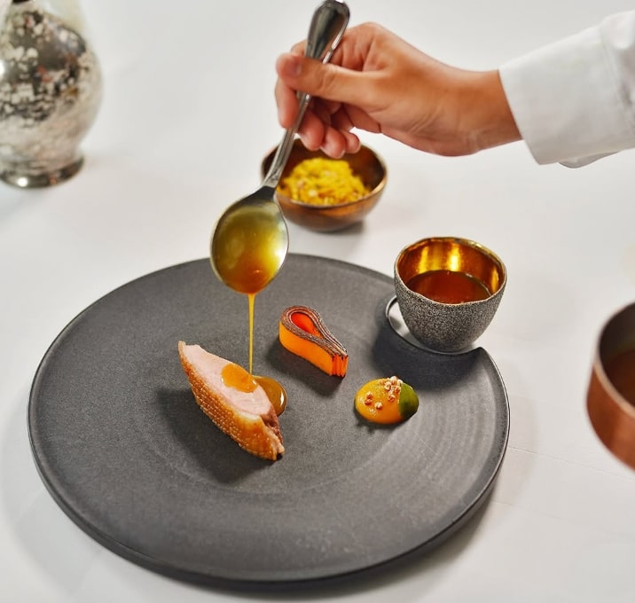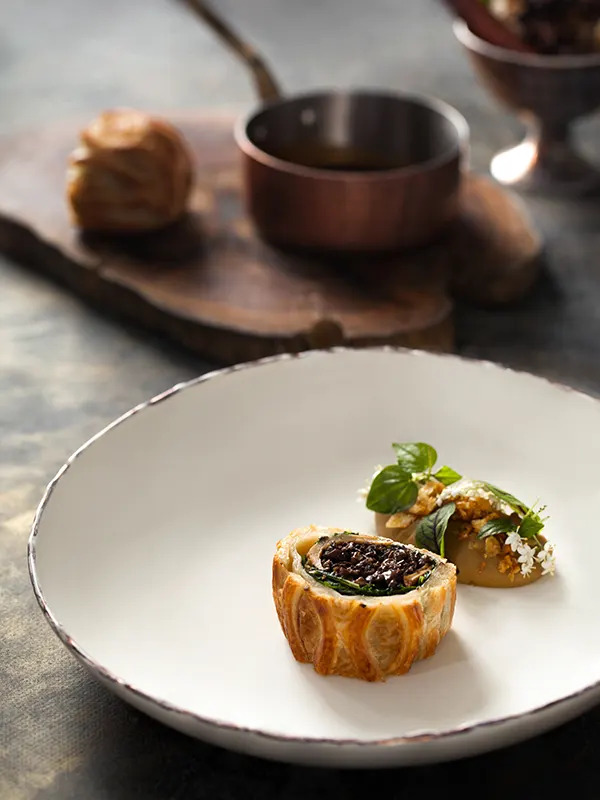 Thực đơn degustation của ông là hành trình vị giác gồm sáu đến tám món, nơi foie gras có thể hòa quyện cùng sốt rendang Java, hay Venison Wellington ẩn chứa hương nhục đậu khấu và me đầy bất ngờ.