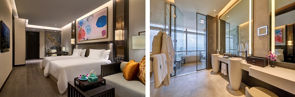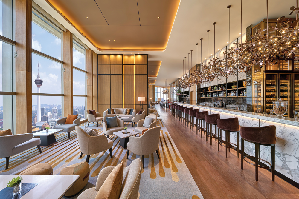 Vừa đặt chân đến đây, các thượng khách sẽ được thưởng thức món trà sả tươi thanh mát tại hành lang tầng 53 trong một không gian đầy quyến rũ mang sắc màu trung tính trang nhã với trần cao và những bức tường kim loại ấn tượng. Phong cách thiết kế sang trọng tiếp tục được thể hiện trong từng chi tiết tại khu vực phòng nghỉ, trong đó căn phòng suite Signature Sky Retreat được trang hoàng khéo léo bởi sàn gỗ với những mảng tường mang hơi hướng hoài niệm pha lẫn những đường nét thẩm mỹ đương đại. Các tiện nghi cũng được trang bị đầy đủ và thuận tiện nhất, tạo cảm giác thoải mái như chính ngôi nhà thân quen. Chiếc divan nơi góc phòng sẽ là vị trí hoàn hảo cho bạn thả hồn mơ mộng trước ánh tà dương lúc hoàng hôn buông sau tháp KL. Để rồi mỗi khi đêm về, bạn lại được nhẹ nhàng đưa vào giấc nồng êm ái bởi hương thơm thoang thoảng từ những loại tinh dầu và trầm hương. Không chỉ thế, khu vực phòng tắm cũng được chăm chút tỉ mỉ với công nghệ cao như toilet thông minh Toto, vòi hoa sen trị liệu ánh sáng và bồn tắm hình bầu dục bên khung cửa sổ hướng ra toàn cảnh thành phố.
