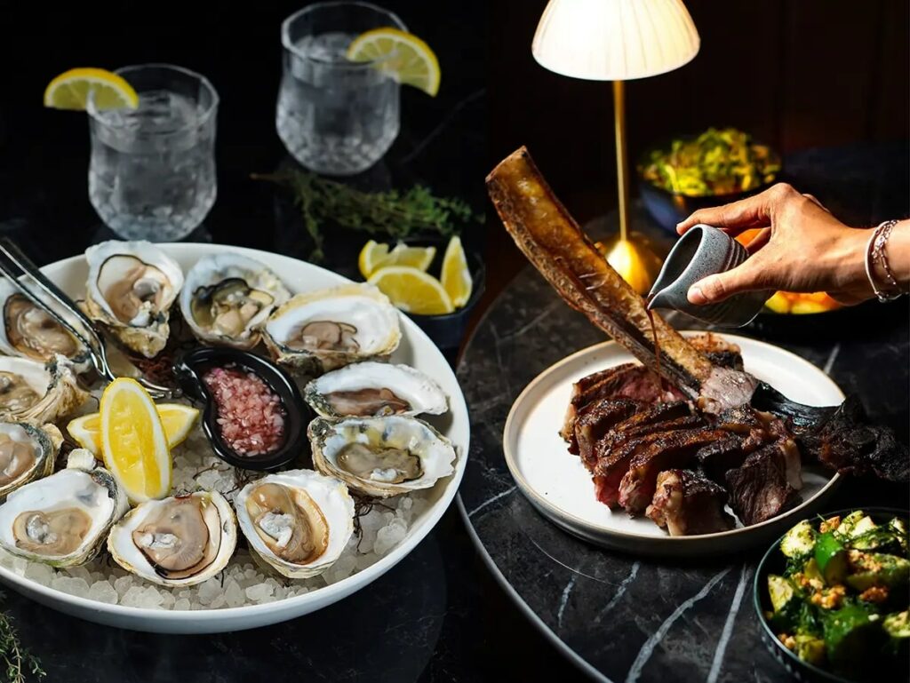 Bếp trưởng Brenton Banner – đầu bếp người Úc từng đạt giải Chef Hat tại Melbourne – mang đến triết lý “tôn vinh nguyên liệu”. Tủ dry-age trưng bày các loại thịt được tuyển chọn kỹ lưỡng: từ ribeye O’Connor, tomahawk USDA Prime 30 ngày, đến Miyazaki A5 và tenderloin Tokusen Wagyu nội địa.