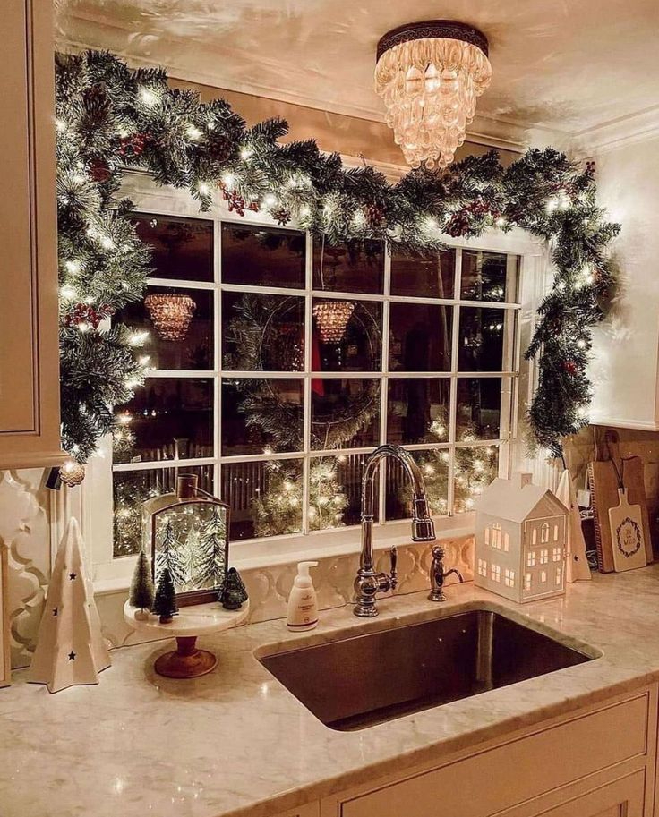 Nếu nhà bếp có gờ cửa sổ, bạn có thể tạo khung cảnh ngôi làng mùa đông của riêng mình vào dịp Giáng sinh này – một xu hướng ngày càng phổ biến. Bằng cách treo vòng hoa/lá, lắp ráp những ngôi nhà mô hình giữa những cây thông Giáng sinh giả, trang trí thêm đèn led dây…, bạn đã tạo nên thế giới thần tiên theo sở thích.