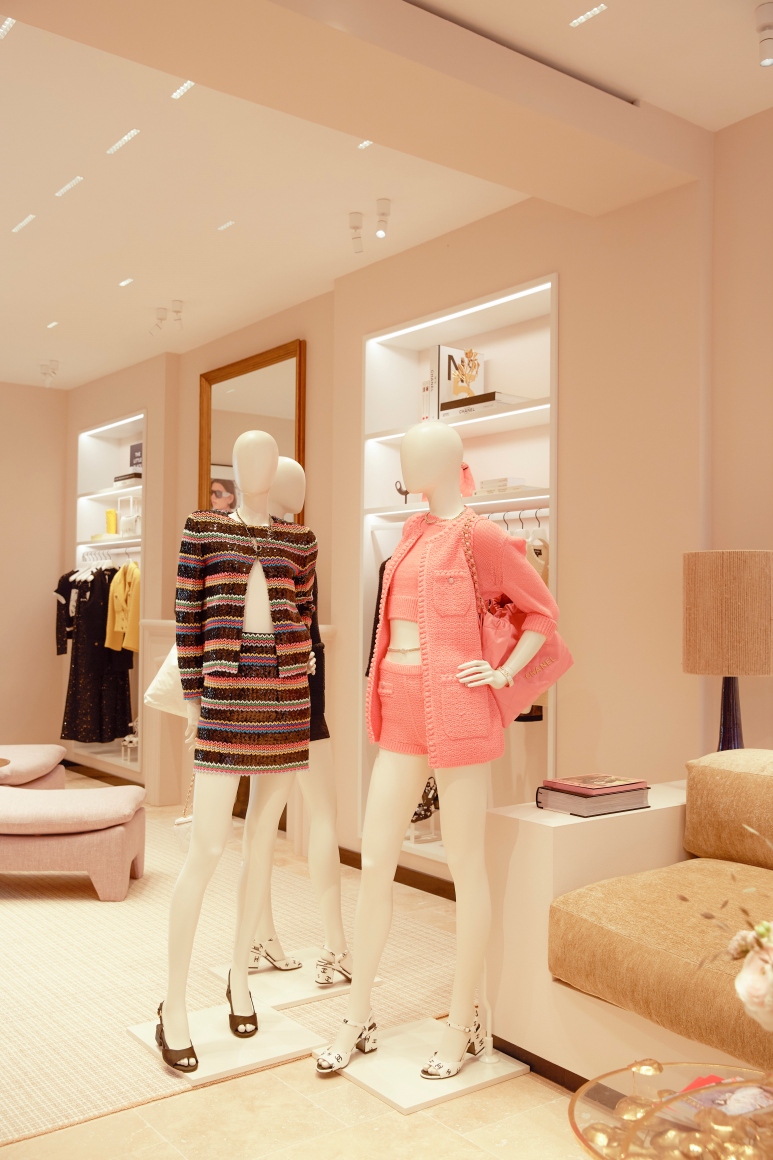 Đó đây khắp không gian thơ mộng kia, tông màu be của sàn travertine lát kiểu La Mã bỗng trở nên hết sức nổi bật khi được song hành cùng những bức tường màu be hồng với những nét vẽ trắng đen điểm xuyết. Các phòng khác nhau của căn biệt thự được trang trí bằng nội thất trang nhã, gợi nhắc về không gian riêng tư của Gabrielle Chanel, nhà sáng lập thương hiệu thời trang đình đám từ nước Pháp. Ngay tiền sảnh, một chiếc ghế cánh án ngữ bên chiếc bàn Goossens có chân đế hình bông lúa mì được dùng để trưng bày các món phụ kiện. Chiếc ghế dài bằng nhung cực lớn lấy cảm hứng từ ghế sofa của chính Gabrielle Chanel tại căn hộ của bà càng làm tăng giá trị của bầu không khí hiếu khách ấm áp. Các hốc nhỏ bố trí trên khắp những bức tường xung quanh là nơi trưng bày những mẫu thiết kế và phụ kiện từ Bộ sưu tập Ready-to-Wear Xuân – Hè 2022 của hãng.