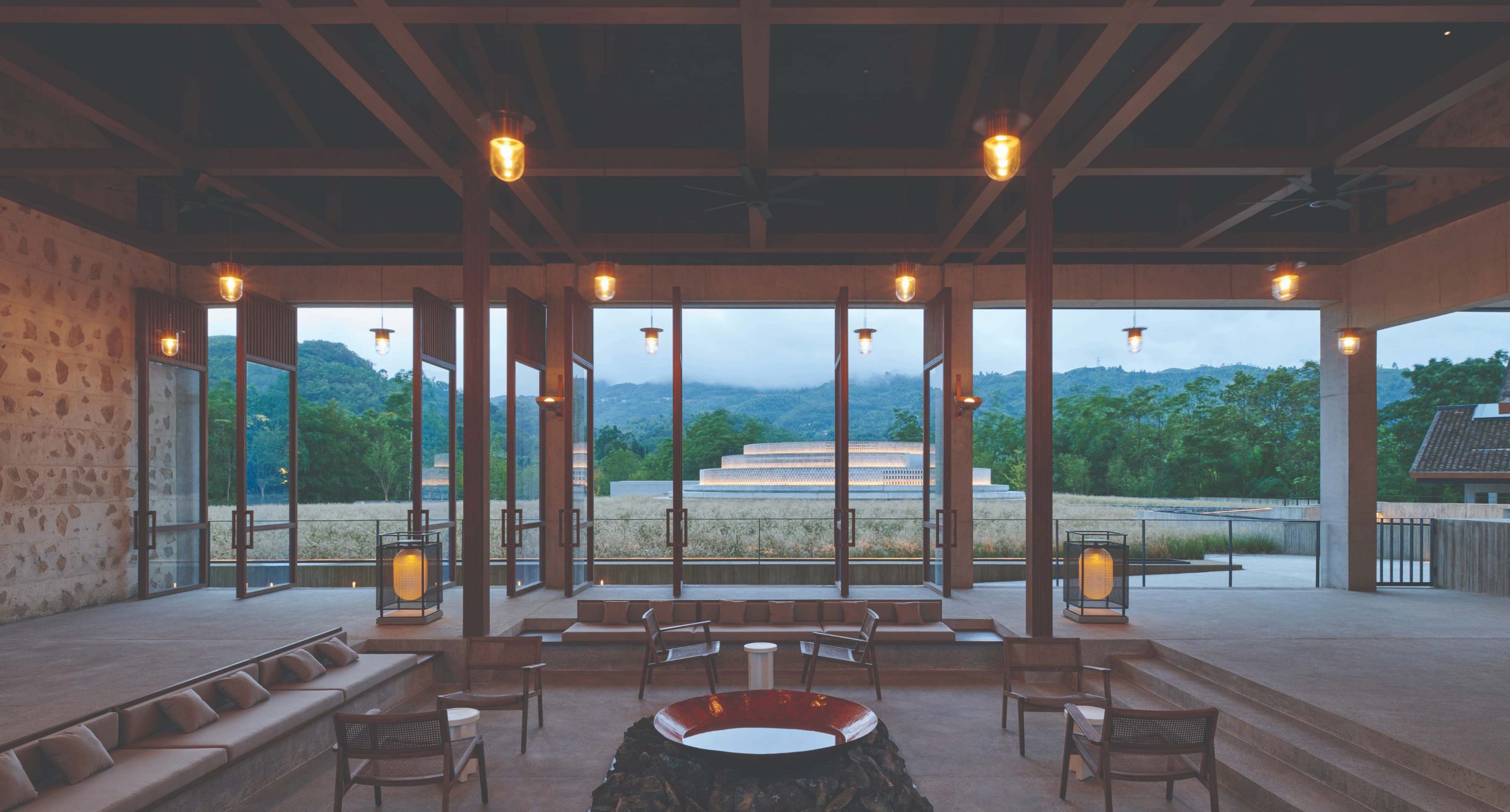 Công trình cũng nằm trong khu vực Di sản Thế giới được UNESCO công nhận, sở hữu tầm nhìn tráng lệ ra núi Nga Mi và được bao quanh ba mặt bởi một con lạch uốn lượn. Điều này củng cố quan niệm của người Trung Quốc về Shan-sui (có nghĩa là “núi-nước”) – chỉ tính hai mặt của các yếu tố tự nhiên tạo nên thế giới của chúng ta – hai lực lượng đối lập nhưng bổ sung cho nhau là sức mạnh và tính vĩnh cửu thường xuất hiện trong kiến trúc.