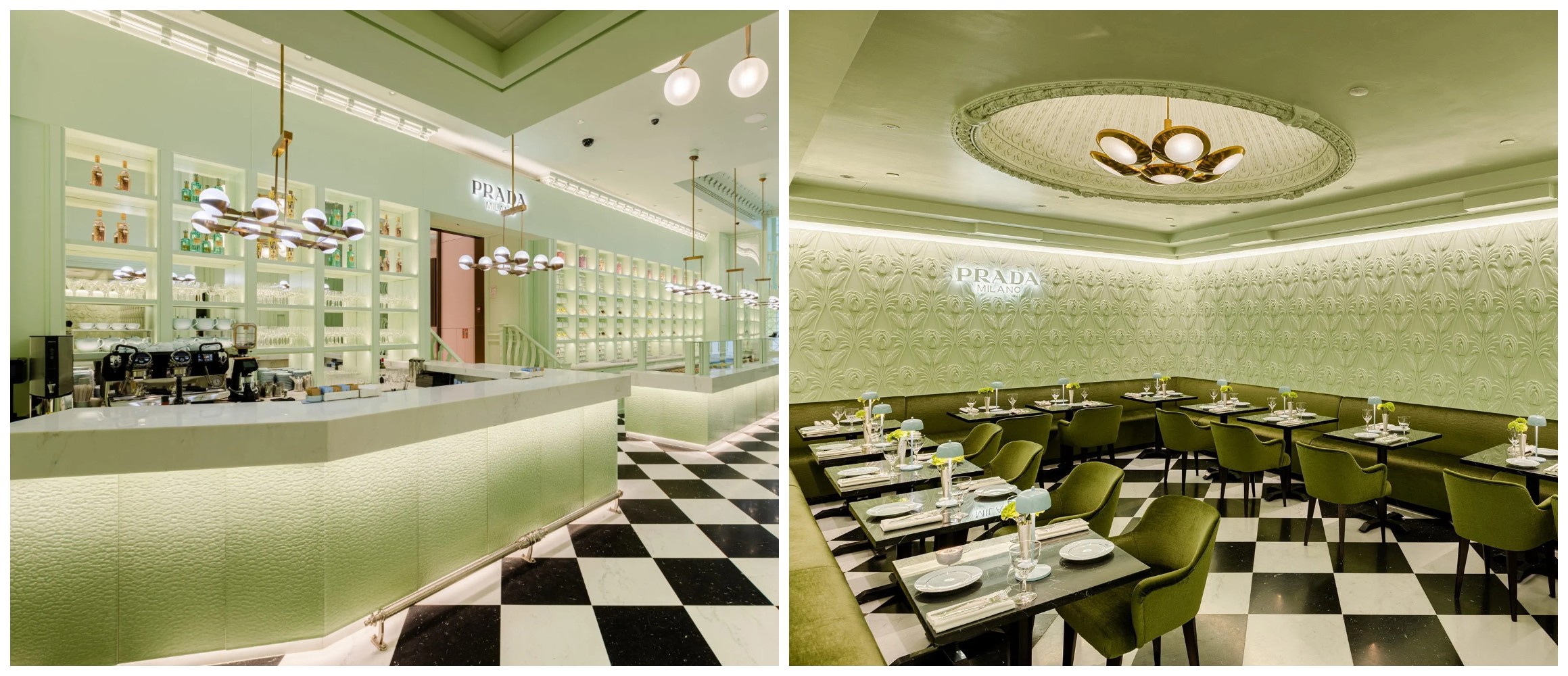 ội thất của quán cà phê pop-up dựa trên phong cách trang trí đặc trưng Pasticceria Marchesi, một cửa hàng bánh ngọt ở Milan mở cửa vào năm 1824. Tại Prada Caffè, các bức tường, trần nhà và đồ nội thất – bao gồm cả chỗ ngồi, ghế bành sang trọng cũng như kiến trúc – đều ‘nhuộm’ sắc xanh mint hay còn gọi là xanh Prada, sắc màu từ lâu gắn liền cùng thương hiệu thời trang nổi tiếng. Đặc biệt, sàn nhà mô phỏng sàn ca rô đen – trắng của cửa hàng Prada lịch sử trên phố Galleria Vittorio Emanuele II ở Milan, trong khi các bức phù điêu hoa lá hiện hữu tại chuỗi cửa hàng thời trang flagship trên khắp thế giới.