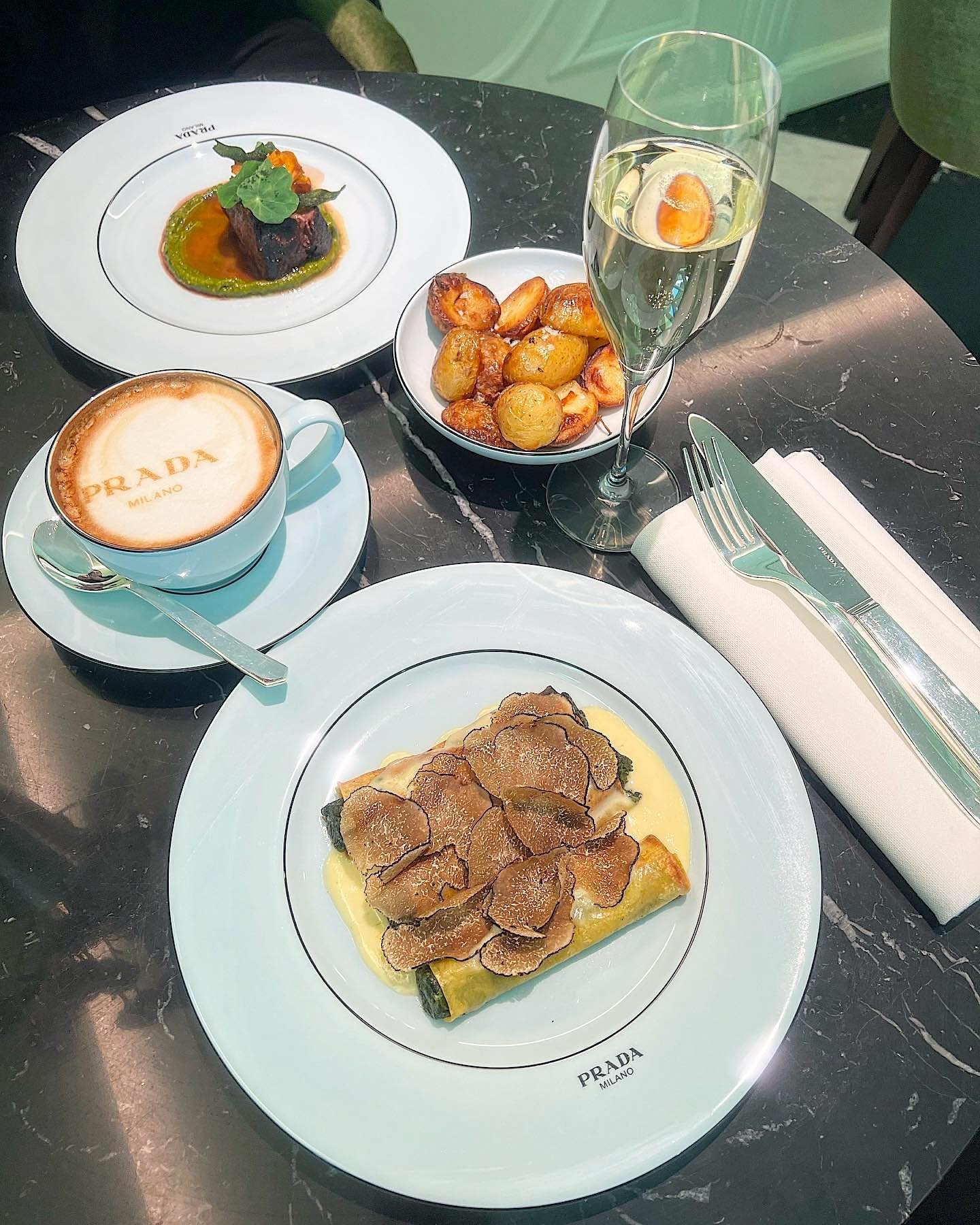 Prada sử dụng bộ đồ ăn độc quyền, hài hòa bầu không gian tổng thể. Đến đây, thực khách ngay lập tức nhận ra bộ đồ ăn gốm sứ Nhật màu xanh dương nhạt với đường kẻ kép đen tương phản, lấy cảm hứng từ đồ gốm Celadon cổ đại – tách trà, cà phê có nắp đậy, ấm trà, đĩa và khay – cho đến vật dụng pha lê, bao gồm cả dòng sản phẩm Triangle của thương hiệu.