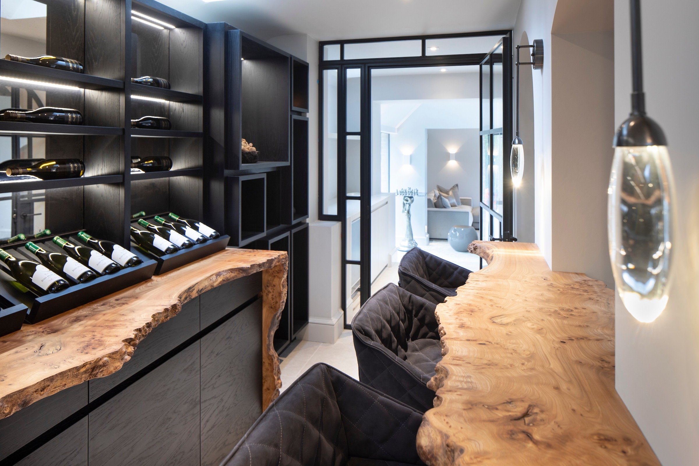 Sang trọng và đẳng cấp, phòng chứa rượu này là hạng mục nổi bật trong quá trình cải tạo một ngôi nhà lớn mang tính lịch sử từ thời Nữ hoàng Ann. Nhà thiết kế nội thất Janey Butler cho biết: “Khách hàng ban đầu muốn không gian này trở thành phòng tập thể dục, tuy nhiên tôi đã khuyên họ không nên làm như vậy. Thay vào đó, chúng tôi đề xuất biến nó trở thành một phòng rượu có thể tận dụng các mái vòm nguyên bản”. Sử dụng màu tro đen bóng bẩy, phòng rượu ấn tượng giờ đây liên kết với nhà bếp. Cả không gian được nâng tầm với cửa ra vào và cửa sổ Crittall, tủ lạnh Gnticnau, hệ thống chiếu sáng tự động và các chi tiết gỗ hữu cơ độc đáo. Butler cho biết thêm: “Những gia chủ rất thích rượu và các hoạt động giải trí với gia đình cũng như bạn bè. Ý tưởng đằng sau quầy bar waney edge là để có thể nếm thử rượu vang và pho mát – đó là một nơi tuyệt vời để ngồi”.
