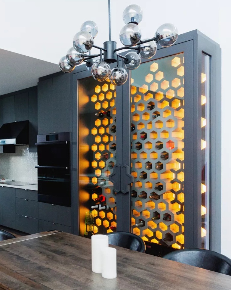 Một chiếc tủ rượu có khả năng kiểm soát nhiệt độ sẽ là “ngôi sao sáng” giữa căn bếp nhà bạn – như cách mà một gia đình ở Québec đã thiết kế. Lấy cảm hứng từ hình dạng của tổ ong, các kệ rượu được đặt làm riêng theo công nghệ cắt laser sao cho chúng thẳng hàng hoàn hảo và có độ sâu phù hợp để giữ chắc những chai rượu. Tủ rượu này cũng sở hữu bảng điều khiển nhiệt độ để gia chủ tùy chỉnh sao cho thích hợp với loại rượu mình đang bảo quản. Đặc biệt, mặt kính mờ còn được trang bị hệ thống điều chỉnh ánh sáng để chuyển đổi sang 14 màu khác nhau tùy theo sở thích hoặc tâm trạng của chủ nhân.
