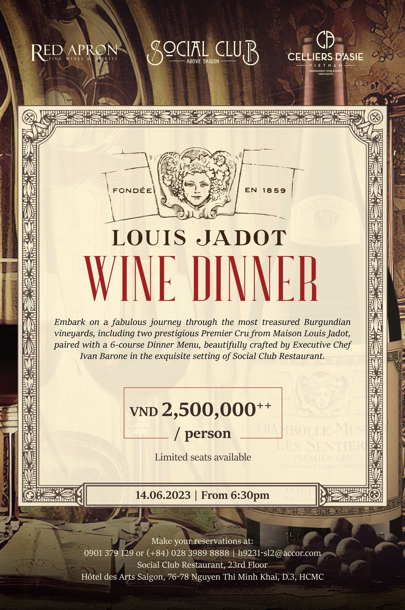 Lạc bước vào không gian Âu Châu cổ điển của nhà hàng Social Club, để những giác quan được đánh thức trọn vẹn bằng một trải nghiệm ẩm thực thượng hạng với bữa tiệc rượu cao cấp “Louis Jadot Wine Dinner” giữa Sài Gòn tráng lệ trên cao, mang đến những hương vị ẩm thực xa hoa, kết hợp cùng các loại rượu vang hảo hạng.