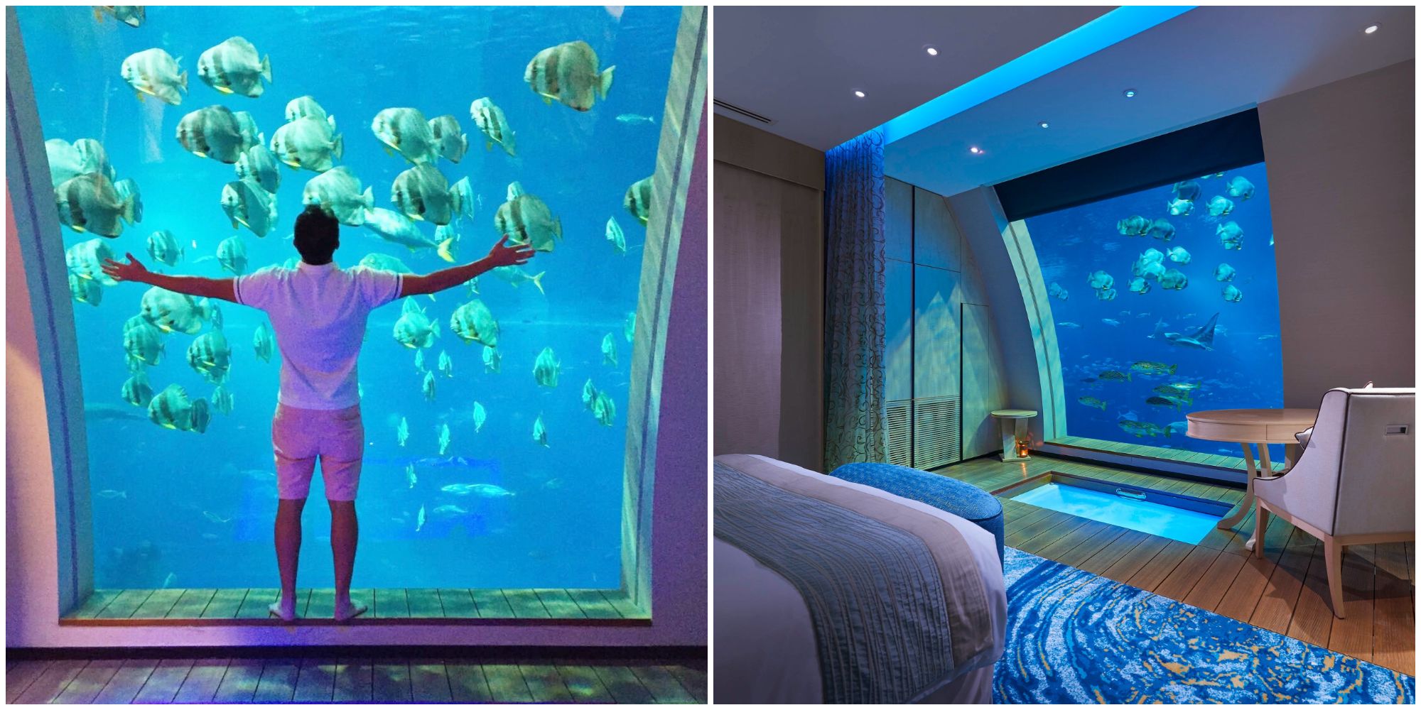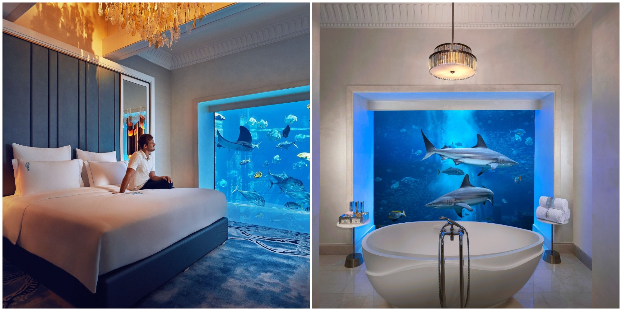 Được lấy cảm hứng từ thành phố huyền thoại đã biến mất một cách bí ẩn, Atlantis là khách sạn sang trọng dưới đáy biển thuộc tổng thể khu nghỉ dưỡng cao cấp The Palm ở Dubai. Các dãy phòng sở hữu thiết kế như một thiên đường dành cho sự yên bình và tĩnh lặng, nơi bạn có thể đắm mình trong làn nước xanh thẳm và ngắm nhìn hơn 65000 loài động vật biển nhờ vào hệ thống cửa sổ lớn kéo dài từ trần đến sàn. Thủy cung thu nhỏ này được trang bị thang máy riêng, sẵn sàng đưa đón du khách lên mặt đất bất cứ lúc nào.