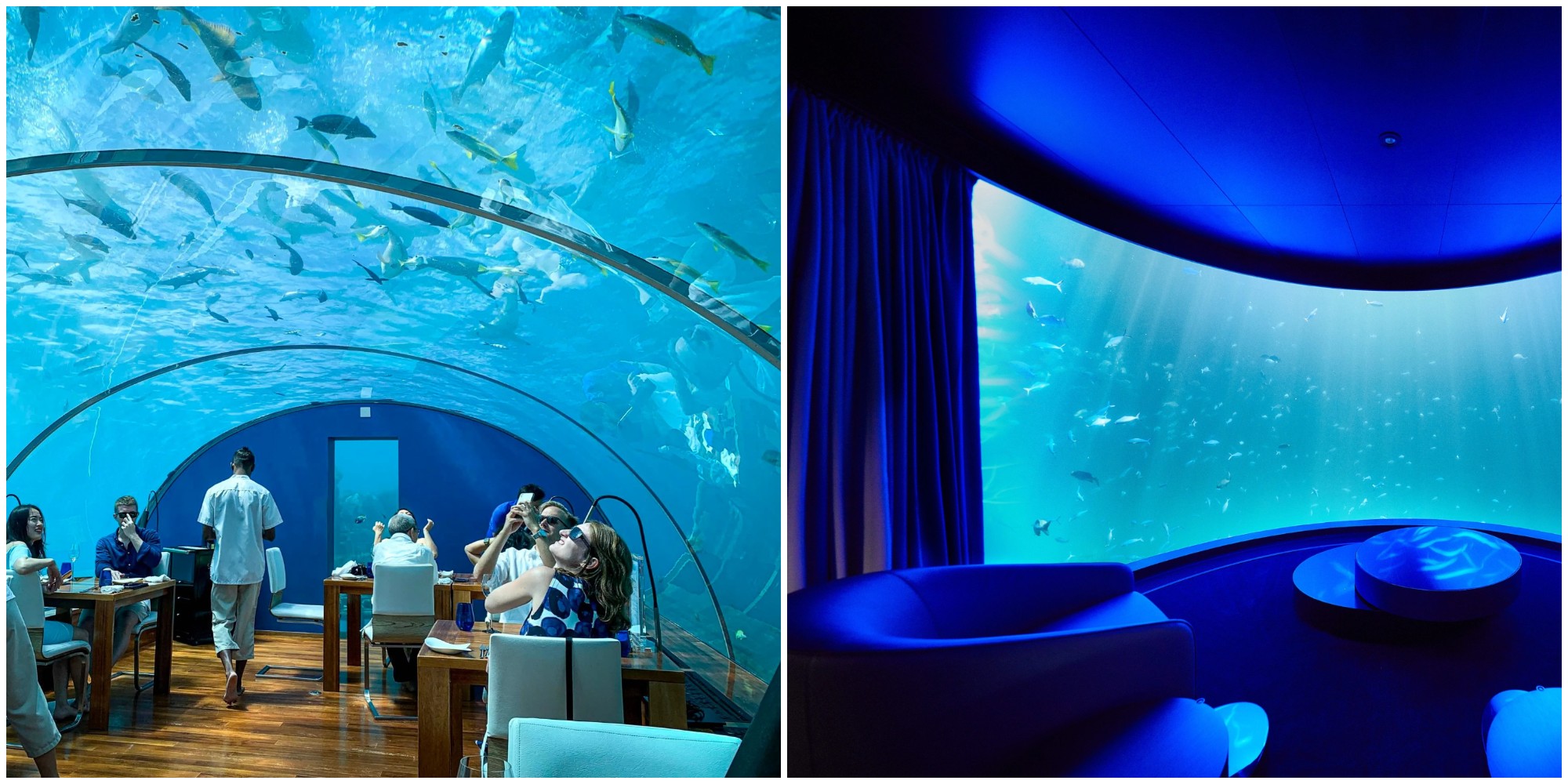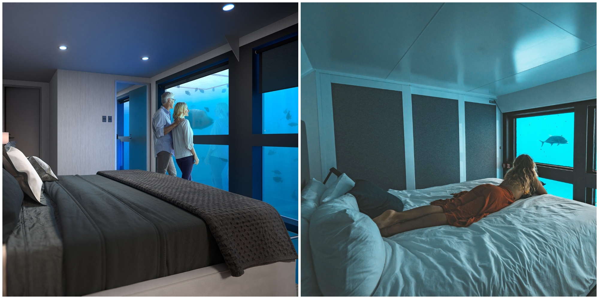 Khi đến thời điểm nghỉ ngơi, căn phòng thủy cung với hệ thống cửa kính trong suốt sẽ giúp bạn tận hưởng vẻ đẹp vĩ đại của thiên nhiên từ những rặn san hô đầy màu sắc cho đến các loài cá heo đang tung tăng bơi lội.