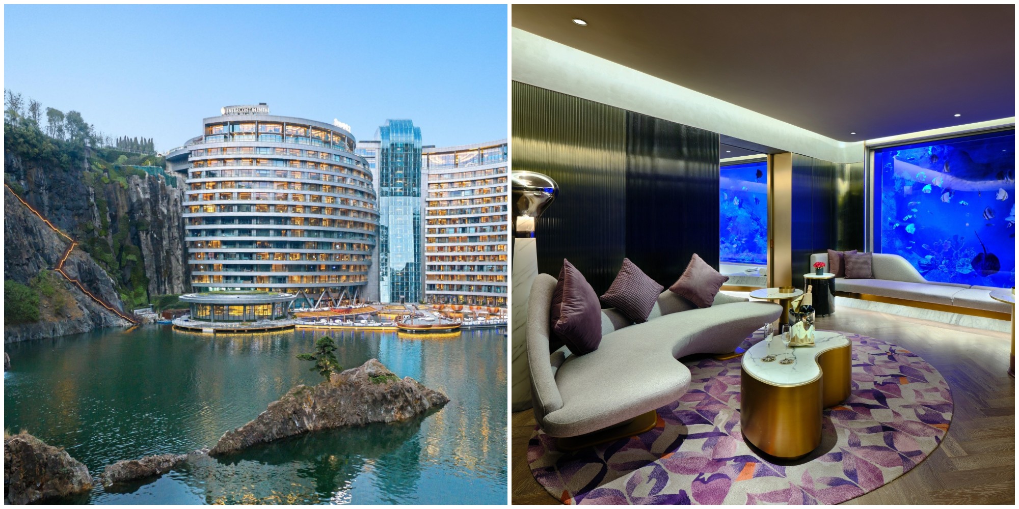 Khu nghỉ dưỡng tuyệt phẩm này được xây dựng trong lòng một mỏ đá bỏ hoang cách trung tâm Thượng Hải khoảng 1 giờ lái xe. Nhiều người ví nơi đây như công trình kiến trúc biểu tượng được sinh ra từ thiên nhiên. Bên cạnh đó, InterContinental còn nổi bật với các địa điểm sang trọng nằm sâu dưới nước dành cho những tín đồ yêu biển. King Bed Suite và Duplex Suite một trong những dãy phòng cao hai tầng dành cho du khách đam mê khám phá thiên nhiên.