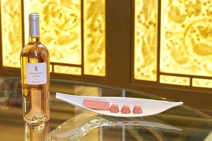 • Maisons Roses de Lafaurie 2021 (Rosé) – phục vụ trong ly phổ thông 100 Points của Lalique và kết hợp với ganache chocolate dâu tây làm từ nhân thạch hoa hồng