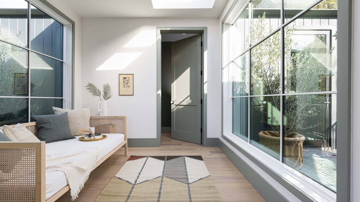 Khu vực ăn uống được bố trí một băng ghế gỗ ở một đầu, ngăn cách phòng khách với nhà bếp. Cửa kính trượt lớn mở không gian bên trong ra khoảng sân. Nhà bếp nổi bật với bức tường gạch Zellige đen, tủ gỗ sồi trắng và mặt bàn đá xà phòng tối màu.