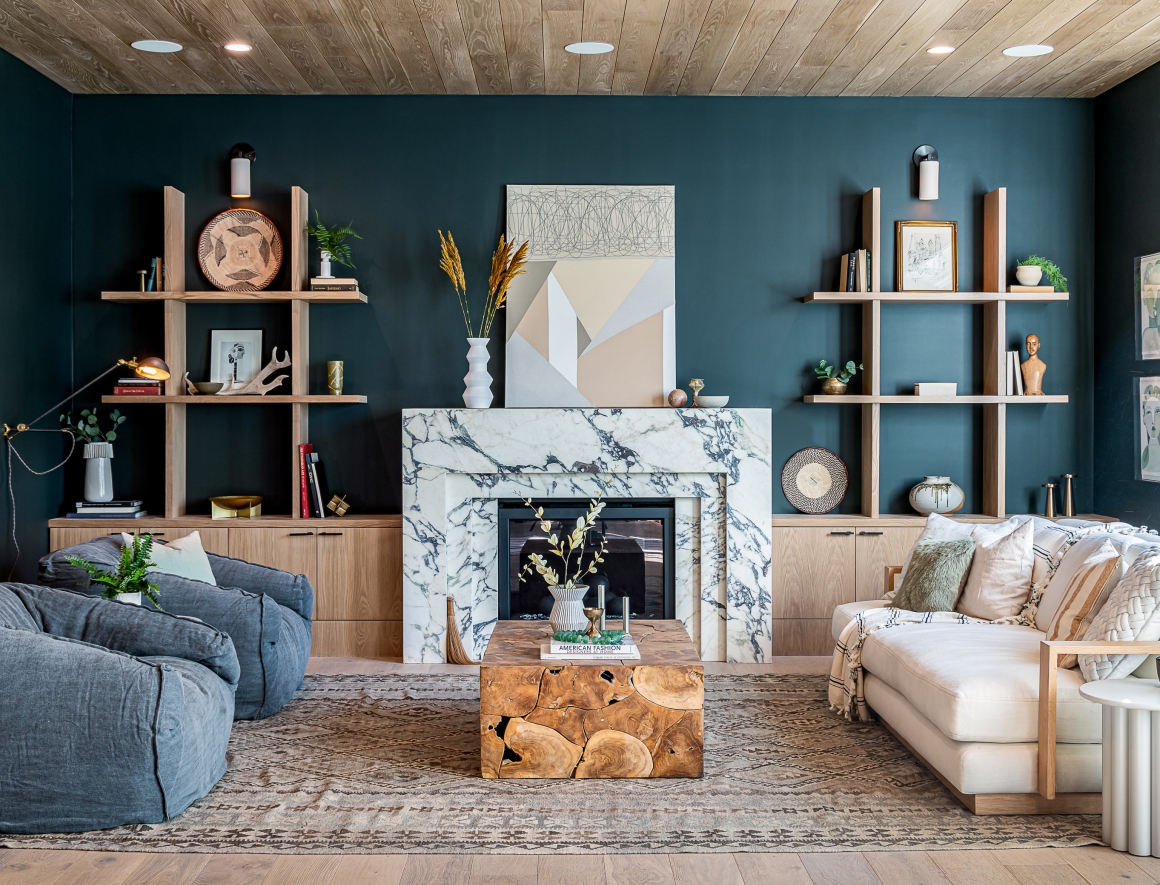 Băng qua lối vào với bàn console bằng gỗ mộc mạc, gương tròn, đèn treo tường và sàn rộng bằng gỗ sồi trắng, bạn được mời chào đến phòng khách có những bức tường tối màu, giá đỡ cùng tủ đựng đồ gỗ, lò sưởi bằng đá cẩm thạch calacatta Rose Corchia.