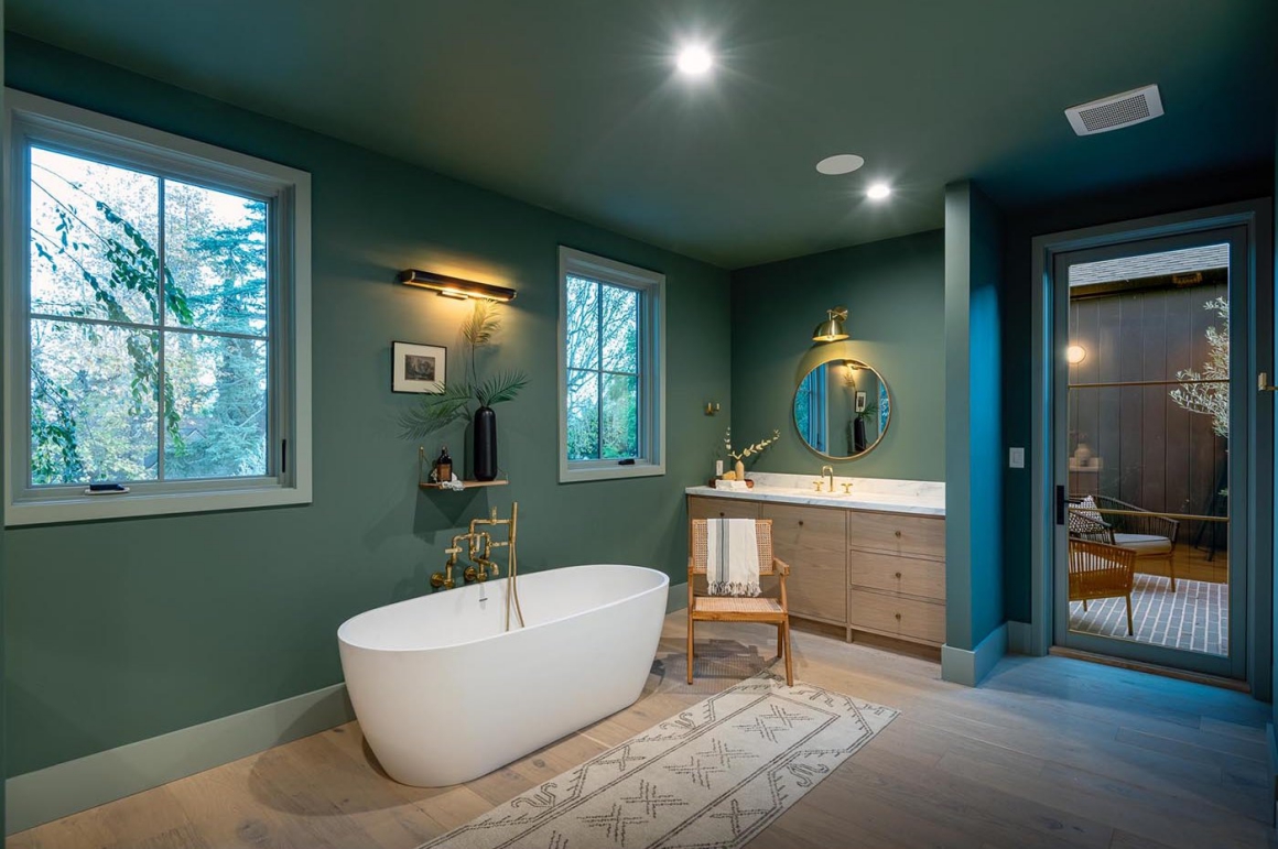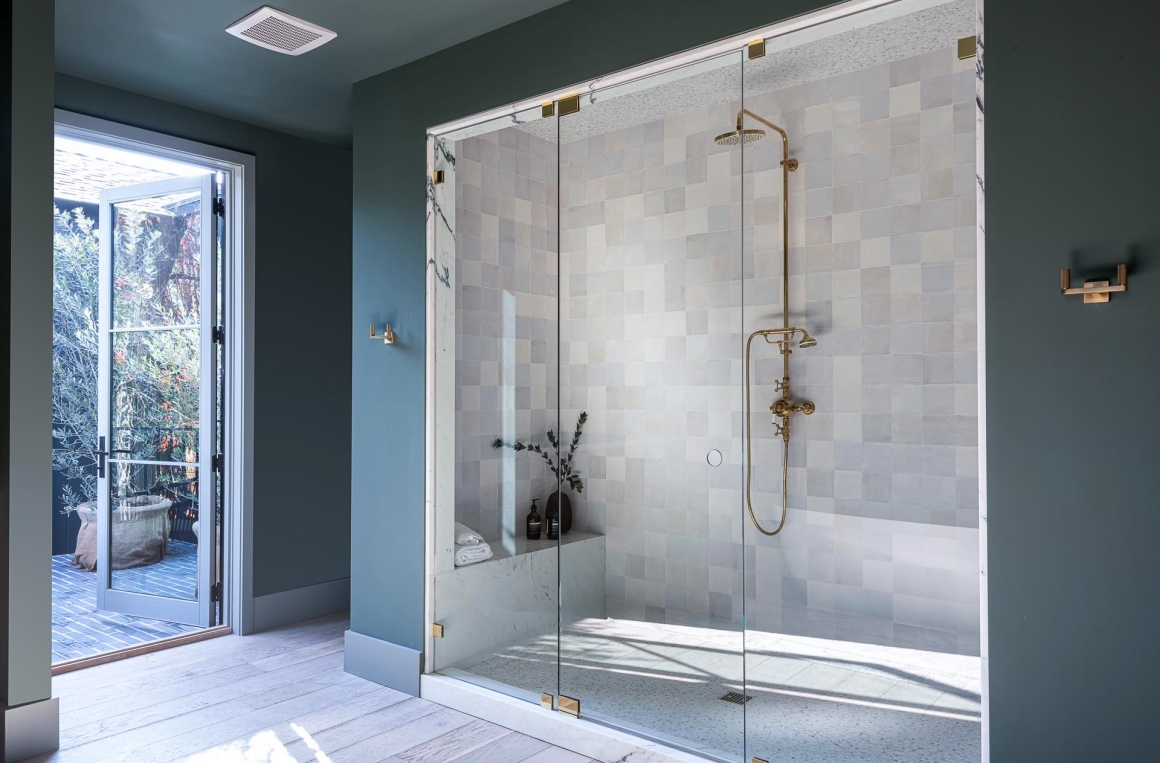 Phòng tắm trưng bày hệ thống vòi nước bằng đồng thau lâu năm lộ thiên của Elan Vital, bồn tắm có chân đế và các bệ đá cẩm thạch phía trên bàn trang điểm gỗ. Góc tắm vòi sen mở bằng kính bao quanh được lót bằng gạch vuông, trong khi một băng ghế lắp ở một đầu.