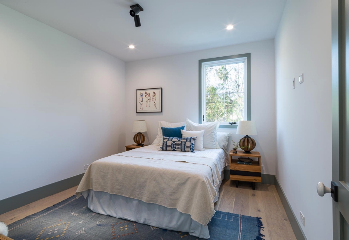 Gian phòng chính được bao bọc bởi một trong những cấu trúc khung chữ A và sơn hoàn toàn bằng tông màu Smoke đến từ thương hiệu Farrow and Ball, bổ sung cho tông màu gỗ ấm áp của tường và sàn. Không gian riêng này có tủ sắt đặt riêng trong tủ quần áo không cửa ngăn lớn và hai sân hiên ngoài trời nhìn ra cả sân trước lẫn sân sau.