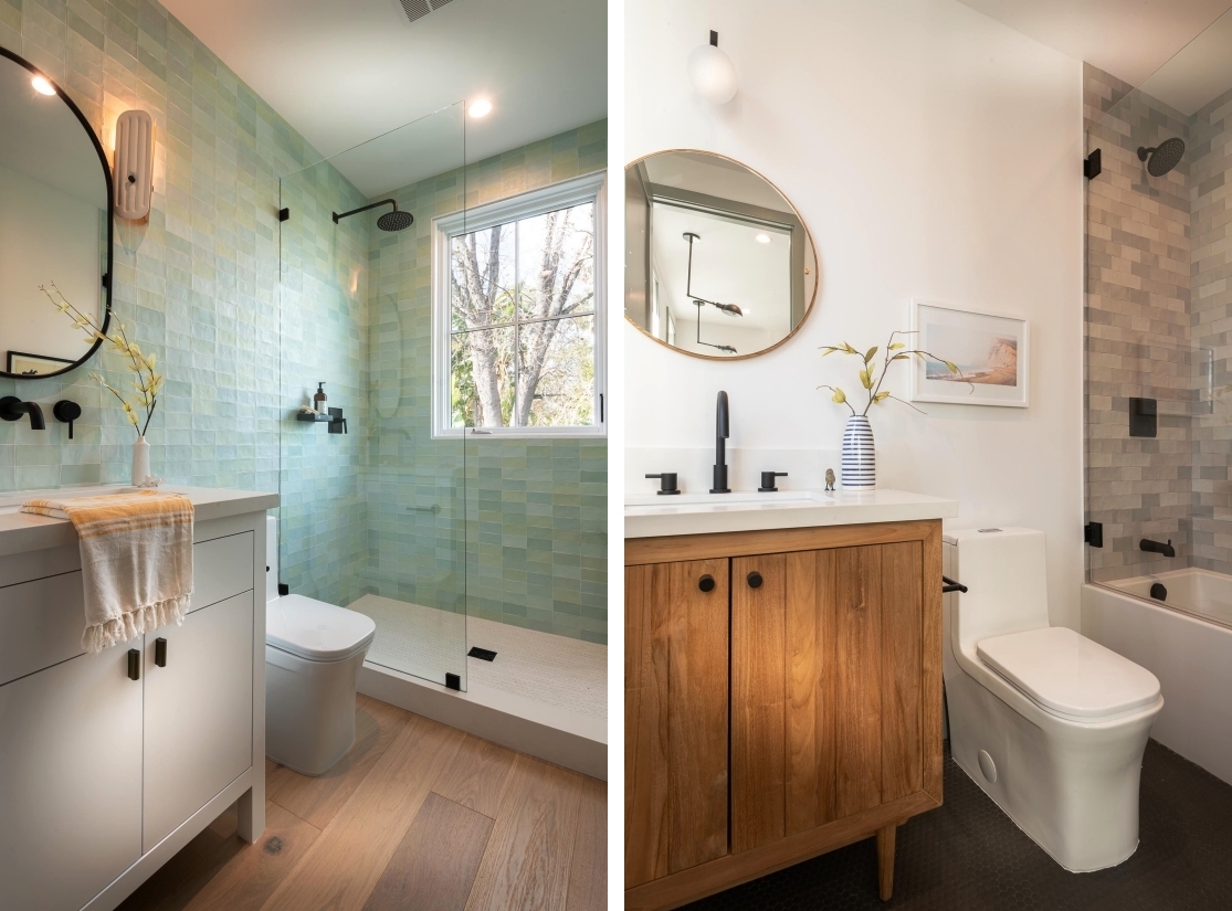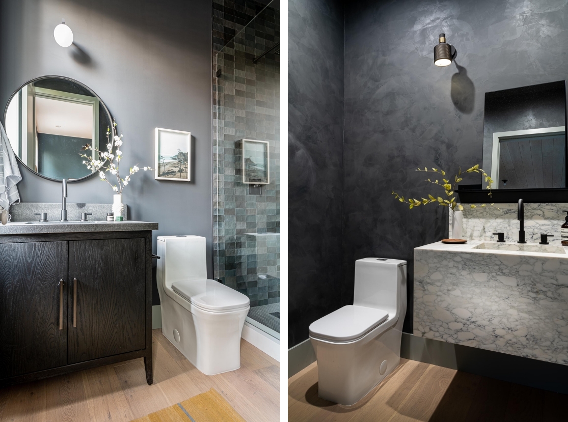 Ở phòng tắm tiếp theo, bàn trang điểm bằng gỗ mộc mạc hơn và phần cứng màu đen xuyên suốt. Trong một phòng tắm khác, những bức tường màu xám đậm giúp tạo ra một cái nhìn ấn tượng. Ngoài ra, ngôi nhà còn có phòng tắm với tường màu xám nhạt, gương tròn và bàn trang điểm gỗ tối màu.