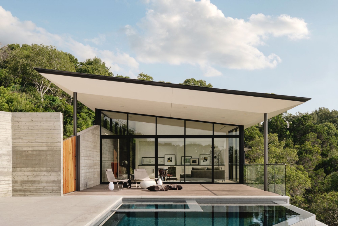 Một con đường trải đầy cỏ chạy dọc theo ngôi nhà và bức tường bê tông giả gỗ và dẫn đưa ta đến lối vào bằng bức tường nổi bật bằng gỗ. Phía hẻm núi của ngôi nhà có kính kịch trần mang tới tầm nhìn không bị cản trở ra hẻm núi và thành phố Austin. Vị chủ nhân cũng có thể thưởng ngoạn quang cảnh này từ hồ bơi nằm ở đầu còn lại của ngôi nhà.