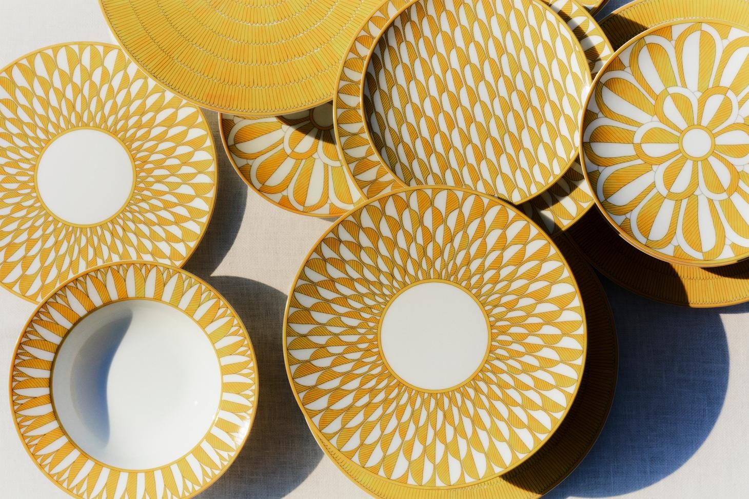 Đĩa mì ống và đĩa súp chỉ xuất hiện các hoa văn quanh mép, còn đĩa trưng bày được bố trí một hoa văn tinh tế màu vàng nằm ngay trung tâm. Bộ sưu tập còn có các đĩa hình tròn và hình bầu dục, tách cà phê và bộ ấm trà cho bữa sáng bình yên, hay các kích cỡ khác nhau của bát cùng với một khay nhỏ.